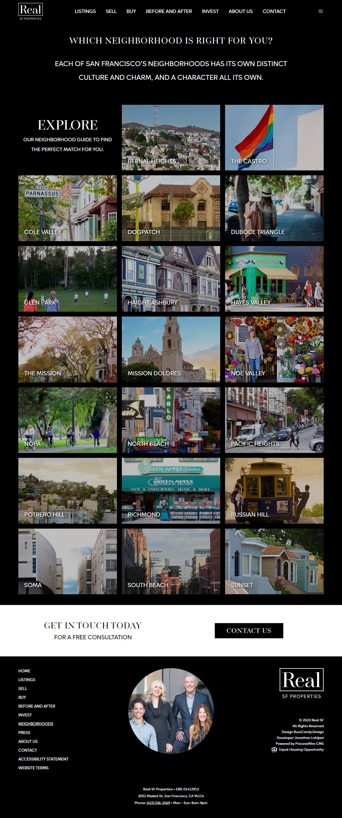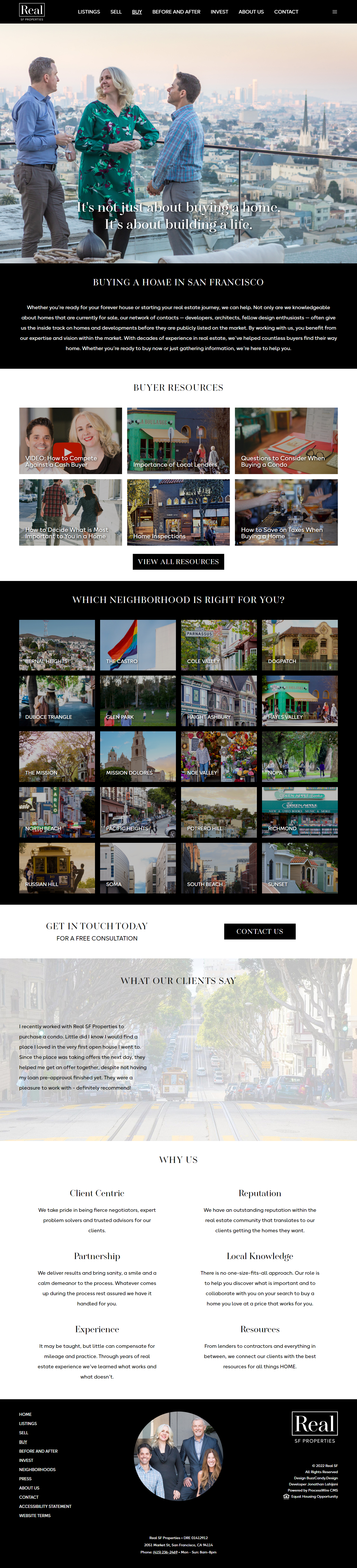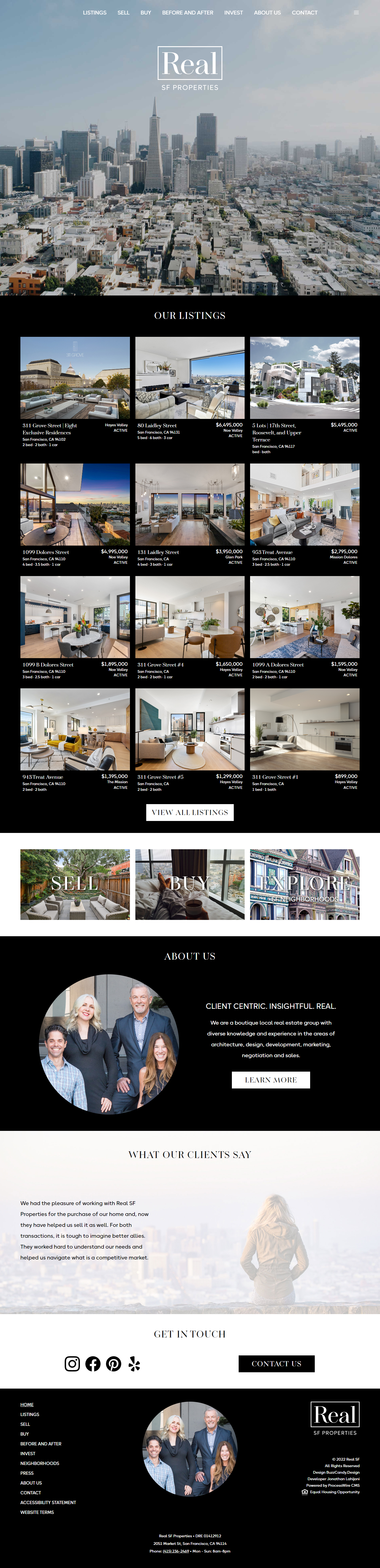 Real SF Properties is a residential real estate agency that represents buyers and sellers in San Francisco, California. As a client since 2014, the second iteration of their website, designed by BuzzCandy.Design, was launched in 2022.