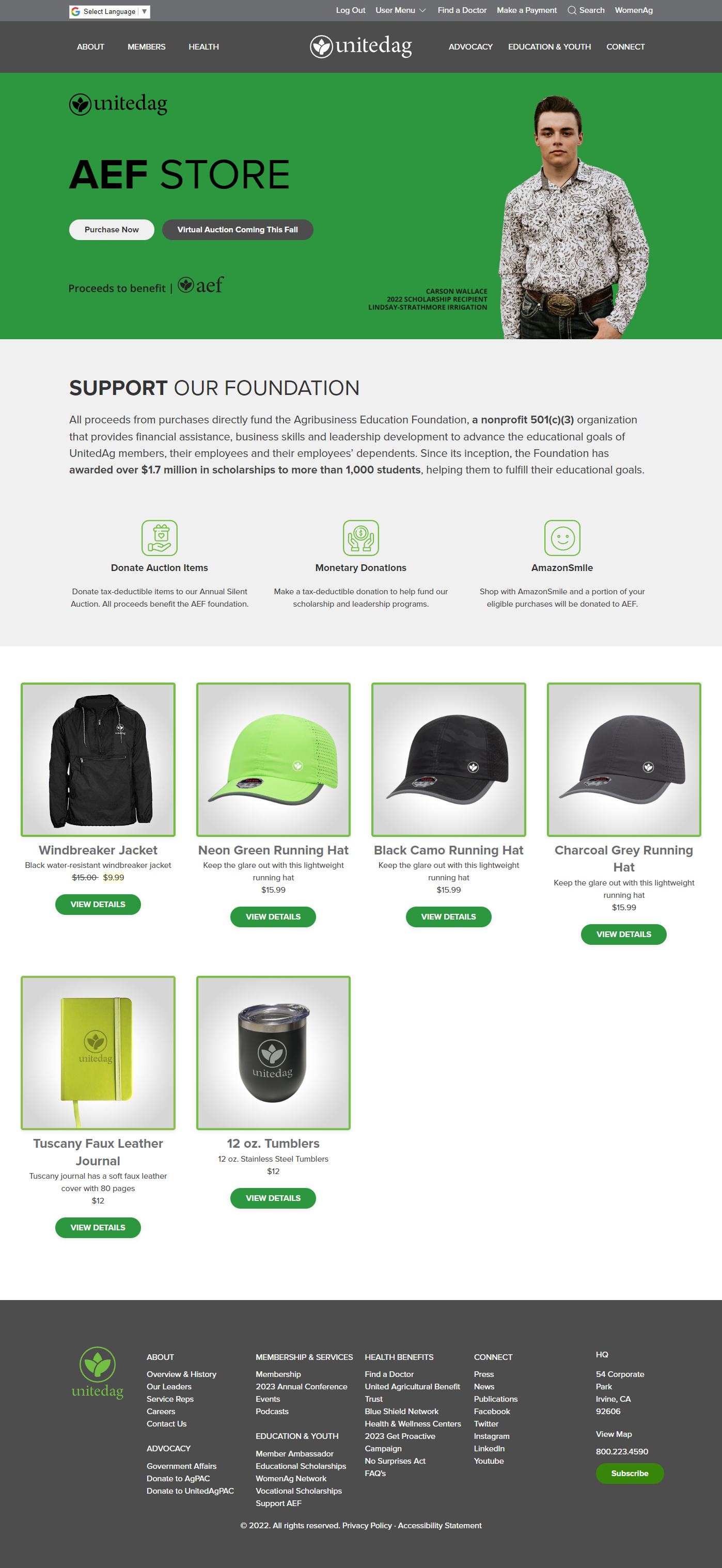 A custom ecommerce system was developed that supports the sales of UnitedAg merchandise. Special features include the ability to hold silent auctions with bidding increments or buy-it-now capability. Stripe powers the payment process.